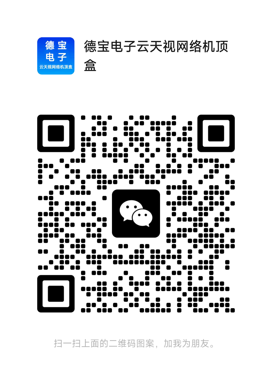 | 微信扫一扫加我们微信 | 云天视网络机顶盒德宝电子淘宝店 |